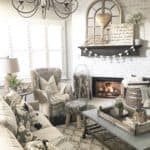 This gorgeous farmhouse living room is stunning. The rug, painted brick fireplace, and rustic is gorgeous. The cute throw pillows window treatment and wingback chair is all too die for! I love everything about this country style room. All decorated on a budget. #farmhouselivingroom #farmhouse #joannagaines #farmhouserug #paintedfireplace